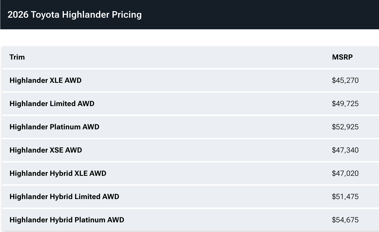 ដោយសារតែការលុបចោលម៉ូដែលមូលដ្ឋាន និងបន្ថែម AWD នេះ ទើបធ្វើអោយតម្លៃចាប់ផ្តើមបានឡើងដល់ $45,270 កើនឡើង $4,950 នេះជាការកើនឡើងយ៉ាងច្រើន ហើយមានន័យថា Highlander ឥឡូវនេះថ្លៃជាង Grand Highlander ដែលមានកៅអីបីជួរ។ Grand Highlander ចាប់ផ្តើមតម្លៃ $41,360 និង AWD មានតម្លៃ $42,960 ប៉ុណ្ណោះ។