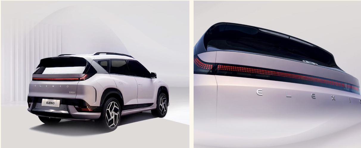 ចំណុចគួរឱ្យចាប់អារម្មណ៍គឺ បន្ទាត់តុបតែងខាងចំហៀងពីក្រោយបង្អួចមានពណ៌ខុសគ្នា ហើយភ្ជាប់ទៅដល់ដំបូលខាងក្រោយ បង្កើតឥទ្ធិពលដូចជារចនាបែបជុំជាបន្ត ហើយភ្លើងហ្វ្រាំងខ្ពស់ និងកាមេរ៉ាមើលក្រោយត្រូវបានបញ្ចូលទៅក្នុងដំបូលផងដែរ។ ទំហំរថយន្ត Elexio EO មានប្រវែង 4,615 មម ទទឹង 1,875 មម និងកម្ពស់ 1,675 មម ជាមួយនឹងគម្លាតកង់មុខទៅក្រោយ 2,750 មម។