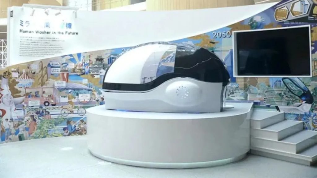បើនិយាយពីការរចនារបស់ម៉ាសុីនងូតទឹកដែលគេហៅថា “Human Washer in the Future” នេះ គឺមានការរចនាដូចអាងត្រីអញ្ចឹង ហើយនៅពេលដំណើរការជាក់ស្តែងវិញ វានឹងបញ្ចូលទឹកដោយស្វ័យប្រវត្តិតែម្តង ពោលគឺមិនចាំបាច់ចុចបើកនោះឡើយ ហើយវាគឺដំណើរការតែប៉ុន្មាននាទីប៉ុណ្ណោះ។