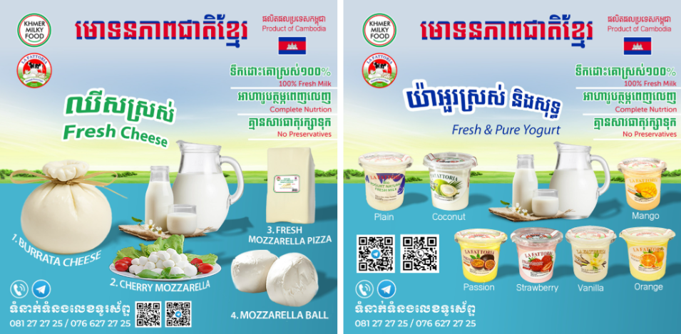 ក្នុងនោះ យើងក៏មាន La Fattoria – ឡាហ្វាតតូរៀ ជាក្រុមហ៊ុនផលិតឈីសដំបូងគេនៅកម្ពុជា។ មោទនភាពមួយ ខ្មែរយើងអាចផលិតបានឈីស ដែលមានគុណភាព និងមានការពិសោធន៍ត្រឹមត្រូវ ទើបអាចចរាចរលើទីផ្សារបាន។ ជាឈីស ដែលផលិតឡើងដោយកូនខ្មែរ បានទៅរៀនរូបមន្តពីប្រទេសអុីតាលីយកមកកែច្នៃបន្ថែមផលិតចេញជាឈីសស្រស់។