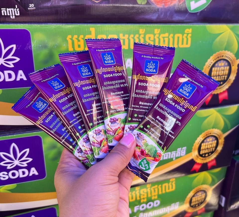 ៤) ម្សៅលាងបន្លែ ផ្លែឈើរបស់ក្រុមហ៊ុន Soda food ដែលជួយកម្ចាត់បាក់តេរី ជម្រះសារធាតុគីមី ក៏ដូចជាថ្នាំពុលកសិកម្ម រួមទាំងជួយរក្សាវីតាមីនបន្លែ ផ្លែឈើមិនឲ្យបាត់បង់។